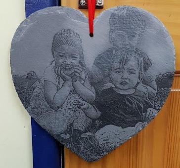 The lovely Lucy Jones was the winner of this beautiful slate heart which we engraved with the photograph of her choice. Seen here receiving her prize from Annette at Severn Trophies (right) and Lucy Jones (left)