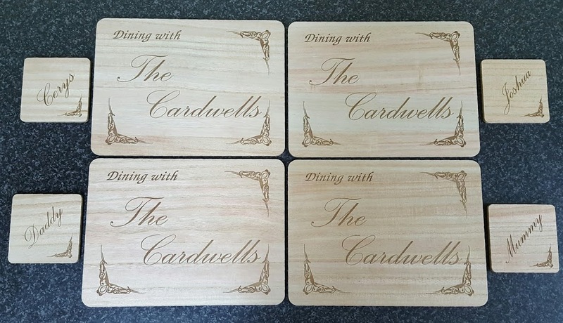 Taking orders for xmas now just £28 for a set of 4 wooden place mats beautifully engraved with 4 matching wooden coasters. Other quantities are available just ask.