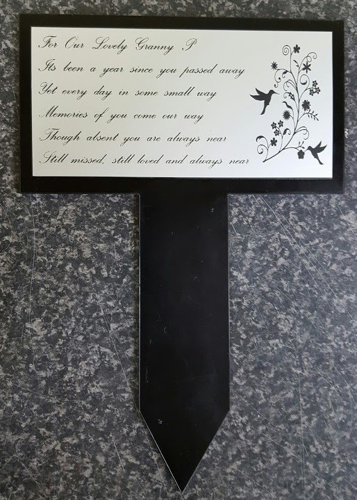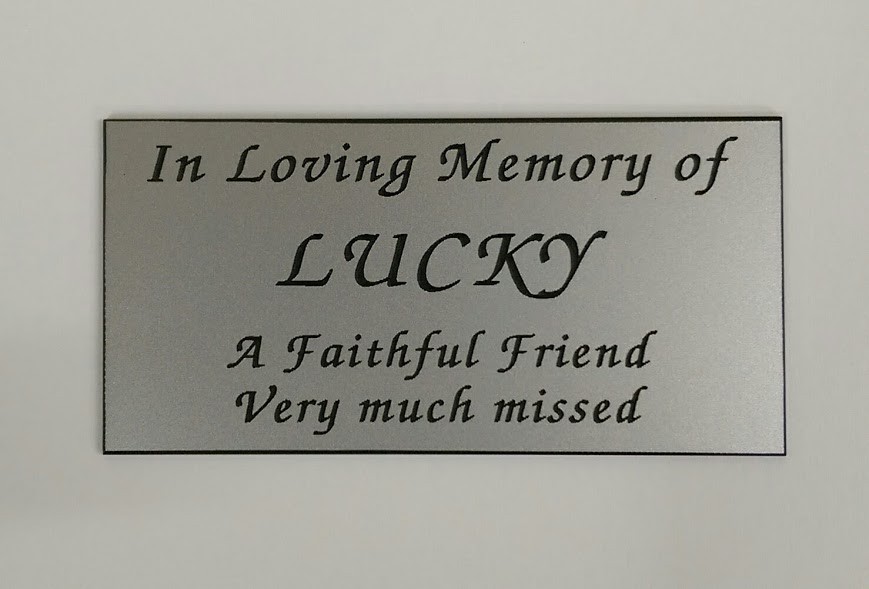 6" X 3" Silver laminate engraved memorial sign mounted onto a black rigid memorial with stake 6.5" wide and 9.5" tall . Any text and a small graphic. Please email me with requirements and i will do you a proof prior to engraving.
