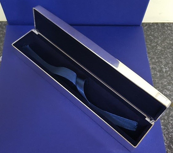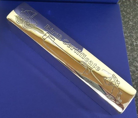 Silver plated Birth Certificate holder . Beautiful item with velour inside and ribbon to tie certificate in place. Engraved with one name up to 10 characters long.