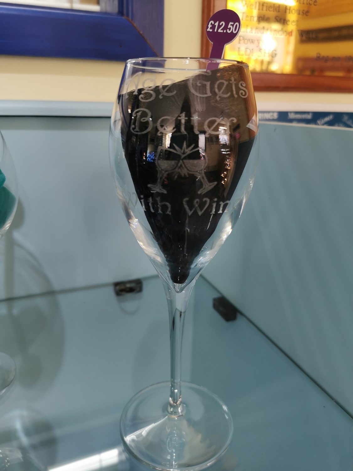 Wine glass engraved with "age gets better with wine" perfect gift. £3.50 to post or email to order if your local and want to collect from the shop.