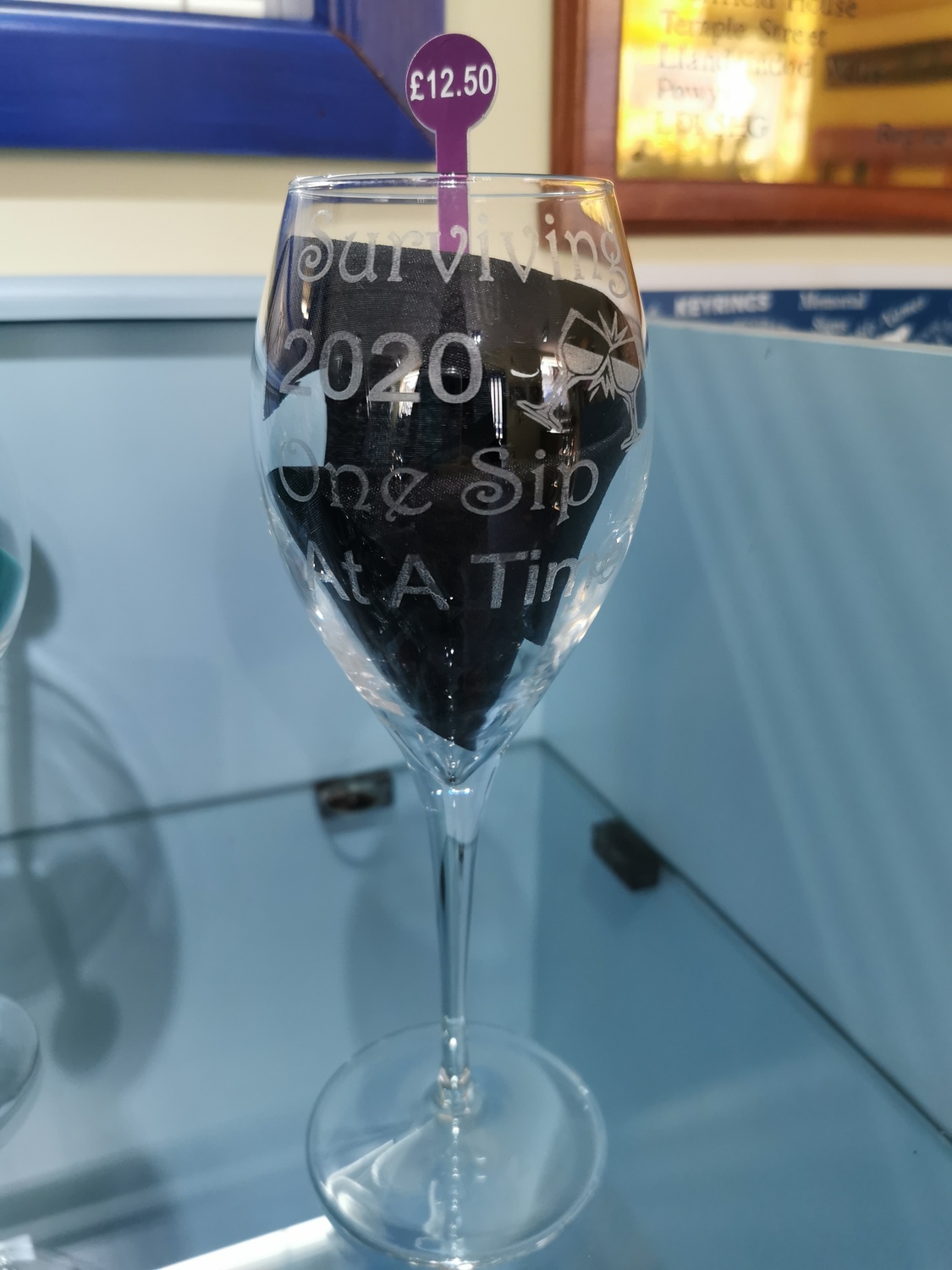 Wine glass engraved with a very apt quote for this year. Surviving 2020 one sip at a time. £3.50 to post or email to order if your local and want to collect from the shop.