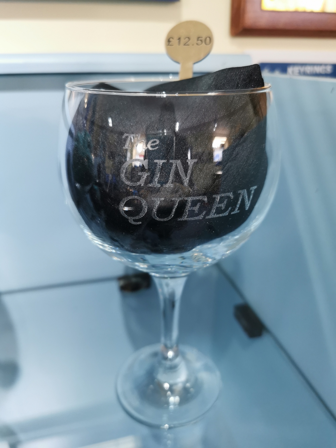 Gin glass engraved with "Gin queen". £3.50 to post or email to order if your local and want to collect from the shop.