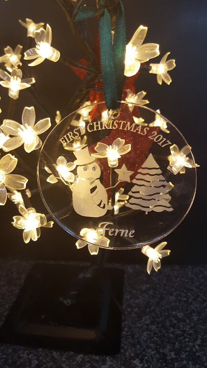 First Christmas tree decoration engraved with the name of your choice. Complete with a ribbon for hanging.