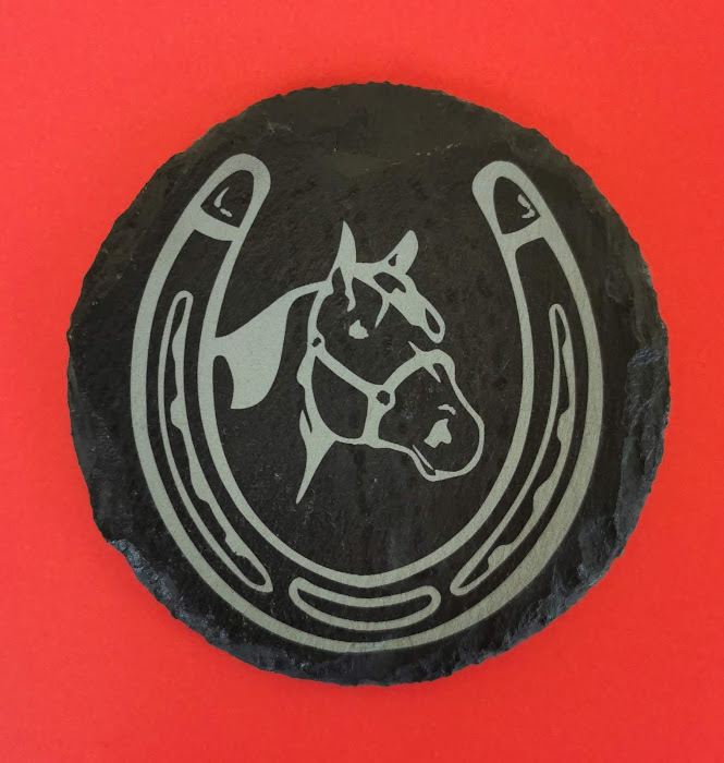 Slate coaster engraved with picture of horseshoe 4" round, great gift. Rubber feet to protect your furniture.
