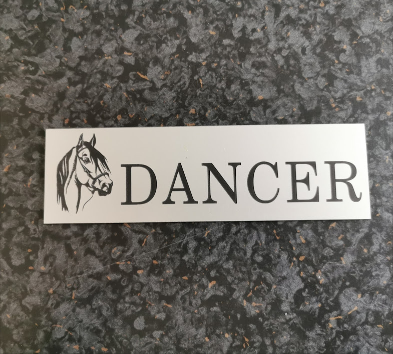 Laminate stable sign engraved with horse head motif and your horses name. Measures 200mm x 60mm. Comes with double sided tape for fixing but can easily be drilled with fixing holes. Please let us know if you would like holes or the item will be sent without them. Please state your horses name on checkout.