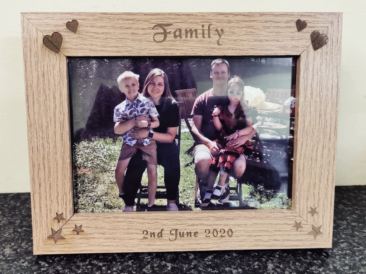 Wooden photo frame engraved with any wording you like. Just tell us what you'd like and we will try our best to do it for for you. Takes a print 5"x 7" can be engraved portrait or landscape. Please state preference on checkout and the wording you would like. Comes with a flexiglass to protect your photo.